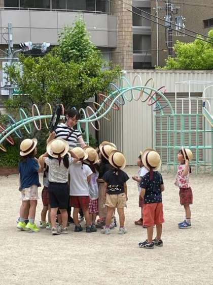 先日ばら組のお部屋でサナギからチョウになりました。「お外に行きたいかな?」「お花の蜜を吸いたいかも…」と子どもたちが言っていたので、飼育ケースを持って園庭に行きました。蓋をあけると