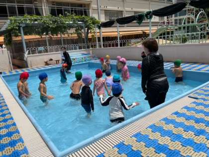 笑顔いっぱい、先生や友達と一緒にプール遊びを存分に楽しんでいました。