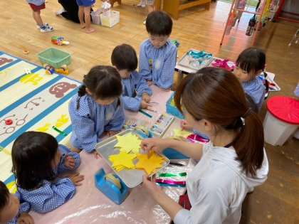 3歳児たんぽぽ組のお部屋では、お星様の七夕飾りを作っていました。セロテープの扱い方を先生におしえてもらいキラキラテープをお星様の形の画用紙につけて大喜びしていました。