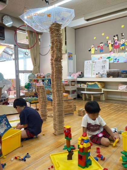 カプラのビル 公開日 2023/07/04 更新日 2023/07/04 うつぼ日記 4歳児ばら組の保育室の中央にカプラのビルが…!もう1ヶ月前からずっとこの場所にあります。プール遊びが始まり水着に着替えたり、お弁当を食べるために机を運んだりしているのに崩れないってすごいな〜みんな気をつけて大切にしながら生活しているんだな〜と思います。 いいね(0)