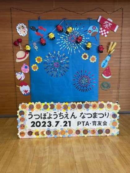 昨日、靱幼稚園PTA育友会主催の夏祭りが盛大に行われました。保護者の皆さんが子どもたちのために企画準備してくださりこの日を迎えることができました。様々なコーナーがあり、子どもたちは大喜びしていました。ここはフォトブースです。友達と…家族と…撮影してもらっていました。