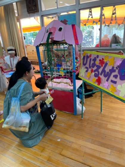 ここは「ひっぱるんだぞうコーナー」ぞうさんの鼻のひもをそーっとひっぱると、何かがすーっと上にあがってきます。お土産は何だろうとワクワクしていました。
