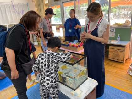 ここは、コイン落としコーナーです。水を入れた水槽の中にある入れ物を目がけて1円玉を落とします。入りますように…と願う真剣な表情がかわいらしかったです。