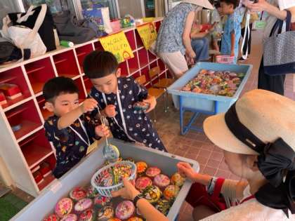 ここはヨーヨーつりコーナーです。子どもたちが大好きなキャラクターの絵のヨーヨーがたくさんあり、大喜びしていました。兄弟や友達と楽しんでいました。