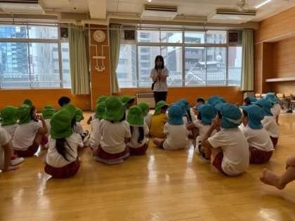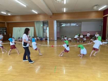 今日は5歳児ゆり組うめ組の子どもたちは遊戯室でつな引きをしました。裸足になって踏ん張りながら、力いっぱいつなを引いていました。友達を大声で応援する子どもたちが大勢いてものすごく盛り上がっていました。