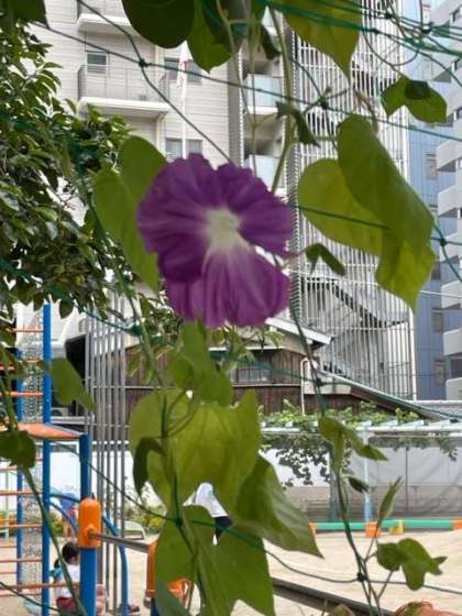 通用門の近くで育てているアサガオ、こんなに綺麗な花を咲かせてくれています。つるがどんどん伸びて…