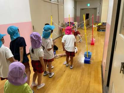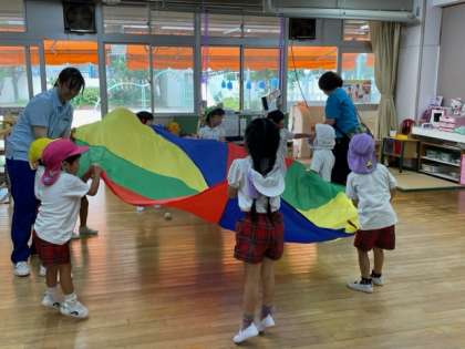 ゴムくぐりが人気で順番待ちの列が出来ています。いろんなくぐり方にチャレンジしています。ミニサイズのパラバルーンは保育室でも十分遊ぶことができます。友達と一緒に持ってパタパタ動かしながら視線を交わしてにっこり笑っています。