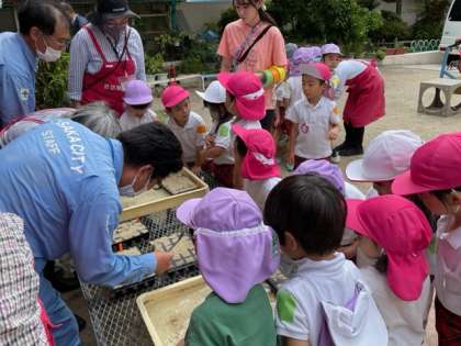 今日は4歳児すみれ組ばら組が種花事業に参加しました。公園事務所の方、緑花会の方にお世話になりました。キンセンカの種を蒔きました。大きくなるのが楽しみですね。