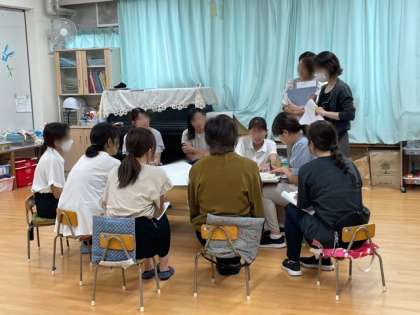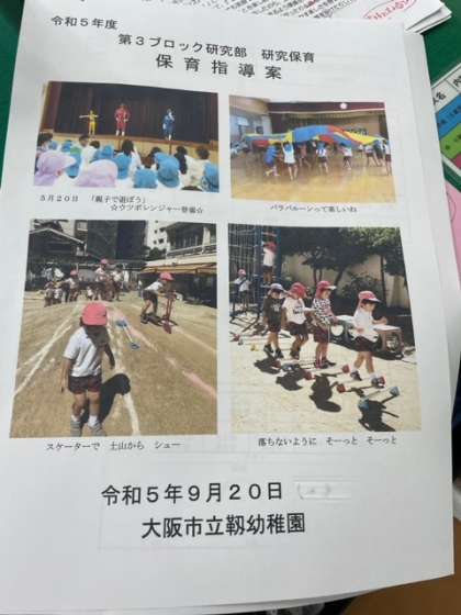 昨日は、大阪市立幼稚園教育研究会第3ブロック研究部の公開保育を行いました。16園の幼稚園から約50名の先生方と教育委員会の指導主事が保育を見てくださり、研究協議を行いました。子どもたちはダンスやサーキット遊び、パラバルーン、ボール遊びなどで存分に身体を動かして遊んでいました。