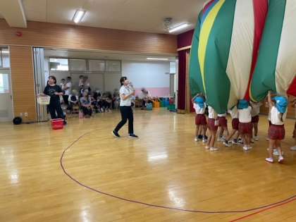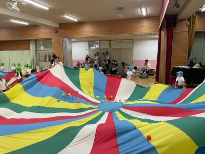 今日はふれあいランドこぐまちゃんのお友達が来る日でした。月に1回入園前のお子さんと保護者に園庭開放を行っています。今日は5歳児うめ組ゆり組がパラバルーンをしているところを見せてくれました。こぐまちゃんのお友達は、目の前にある色鮮やかでものすごく大きいパラバルーンが動く様子をじっと見てくれていました。保護者の皆さんは5歳児の演技に拍手を送ってくださいました。