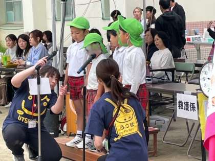 運動会 公開日 2023/10/15 更新日 2023/10/15 うつぼ日記 運動会のプログラム紹介を5歳児うめ組ゆり組の子どもたちがしました。大勢の人の前で堂々と自信をもって話す姿はとってもたくましかったです。 いいね(0)