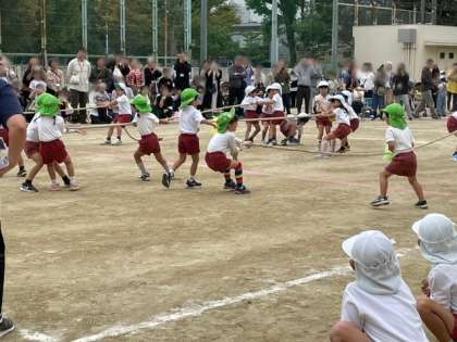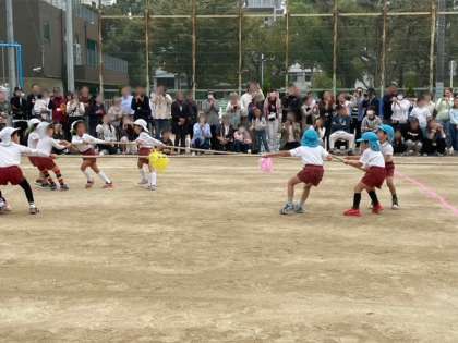 5歳児ゆり組うめ組「ひっぱれひっぱれ」です。クラス対抗で綱を引き合います。自分の綱引きが終わると他の綱引きの応援に加わることができるというルールです。これまで経験を重ねるごとに綱の引き方がどんどん変わってきました。力強く引っ張り、他の応援のための移動も素早くなりました。友達と一緒に力を合わせる5歳児の綱引きは見応え十分でした。