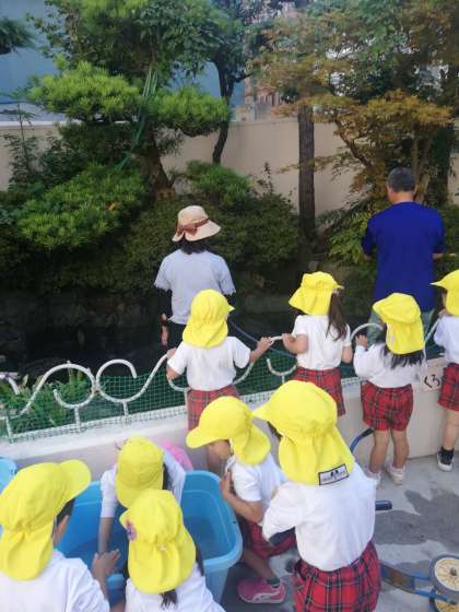 次々と集まってくるたんぽぽ組の子どもたち、池の水がなくなり大人が中に入っていることに驚いていました。池の掃除を見ることで生き物を大切にする気持ちにつながると嬉しいです。