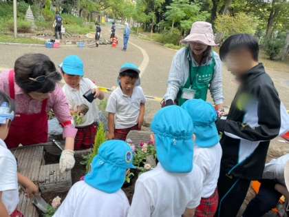 今日は5歳児うめ組ゆり組の子どもたちが靱公園の花壇にいろいろな花の苗を植えさせてもらいました。公園事務所や緑花会の方々には何度もお世話になっているので親しみを感じています。今日は花乃井中学校2年生の生徒さんが職場体験に来ていたので花を植えるお手伝いもしてくれました。