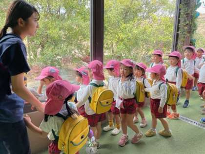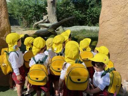 3歳児は入園して初めての園外保育です。先生の話をよく聞きながら園外での活動を楽しむことができました。これまでの幼稚園生活で様々な経験を重ねて安心して楽しく過ごすことができたからだと思いました。動物たちを身近に感じて驚いたり喜んだりしていました。