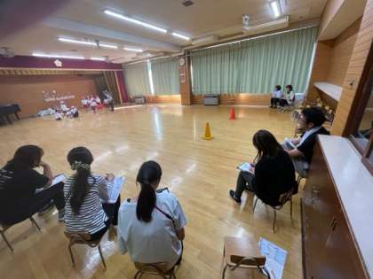 午後からばら組の園内研究保育を行いました。ばら組のみ午後保育、他のクラスは午前中保育なので皆でばら組の保育の様子を見て研究協議を行います。今日の保育のねらいは?友達と一緒に体を動かして遊ぶ楽しさを味わう?ボールを使ったいろいろな遊びを知り様々な動きを楽しむ でした。