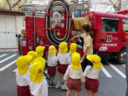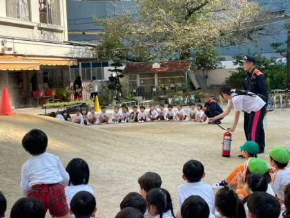 今日は火災想定の避難訓練を同じ建物のうつぼほんまち保育園さんと合同で行いました。子どもたちはベルの音と先生の話を聞いて速やかに避難することができました。職員は消防署員立ち会いのもと、消火訓練と通報訓練を行いました。訓練後、消防自動車を見せてもらいました。今後も非常時に備えて迅速かつ臨機応変に対応できるようにしておき、子どもたちの安全を守るようにしたいと思います。