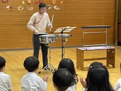 ?今日は月1回幼稚園に来ているボランティアの学生が3歳児4歳児に楽器演奏を披露してくれました。音楽学部に在籍している学生さんでマリンバ専攻だそうです。幼稚園にある楽器で子どもたちのために演奏してくれました。特に小太鼓(学生さんはスネアと呼んでいました)のバチさばきは見事で、子どもたちは驚きと喜びの気持ちを存分に味わっていました。生演奏って素敵だなと思いました。