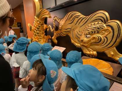 園外保育 公開日 2023/11/10 更新日 2023/11/10 うつぼ日記 天守閣2階の金の虎とシャチホコのレリーフです。この虎は「伏虎」というそうです。「阪神タイガース優勝したな〜」と言って虎を見ている子どももいました。 いいね(0)