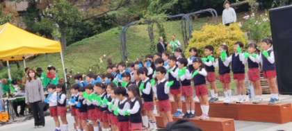 昨日のコンサートでは、ゆり組が黄緑、うめ組が水色の手袋をつけて歌いました。靱公園の美しい自然の中で手袋の色が映えます。子どもたちの歌声に合わせて花が咲いたようでした。