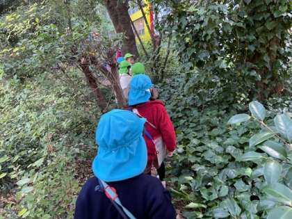 靱公園の中でもこんな場所を歩いて行くと「探検や!何か見つかるかも!」と言っている子どもたちがいました。付き添いの私たちもワクワクしてきました。靱公園の一角に「いのちの森」という場所があります。昆虫や野鳥のための生息地だそうです。