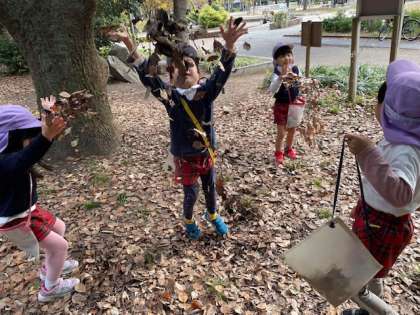 今日は3歳児4歳児が靱公園にお散歩に行きました。どんぐりを拾ったり落ち葉で遊んだり、秋の自然に存分に親しんで過ごしました。幼稚園から歩いてすぐの場所にこんな公園があるだなんて素敵です。夏が終わりすぐに冬がやってきた…なんて思っていましたが、子どもたちは秋を感じて楽しんでいます。