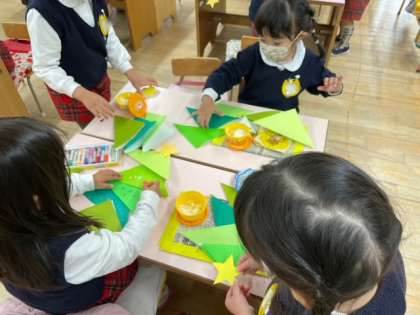 3歳児たんぽぼ組ではツリーを作っていました。紙を折ったりのりを塗ったりして指をしっかり使っています。幼稚園の生活で初めての経験のひとつがのりを使うことかもしれません。指先を使うこと、適量に気づくこと、いろいろな経験になっています。