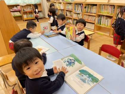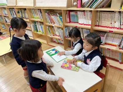 幼稚園の3階には多目的室と絵本室があります。3歳児もも組の子どもたちが、それぞれ絵本室にあるたくさんの絵本の中から自分で手にとったものを見ていました。お友達とのおしゃべりも楽しそうです。このあとはクラス全員集まって担任の先生から絵本を読み聞かせてもらいました。