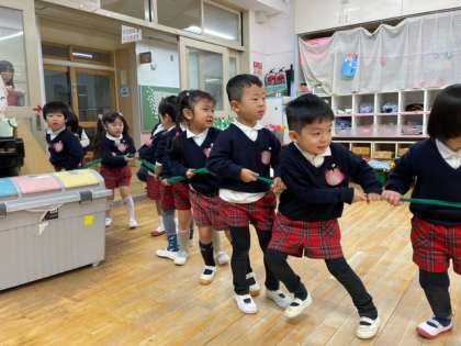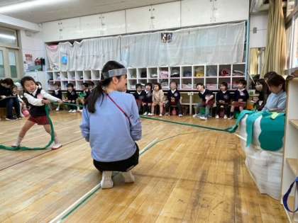 引っ張ってみよう。「うんとこしょ、どっこいしょ」もも組の子どもたちの声がそろいます。みんなで一緒に言うことを楽しんでいます。1人では抜けないからみんなで抜いてみよう。「うんとこしょ、どっこいしょ」のかけ声がさらに大きくなります。