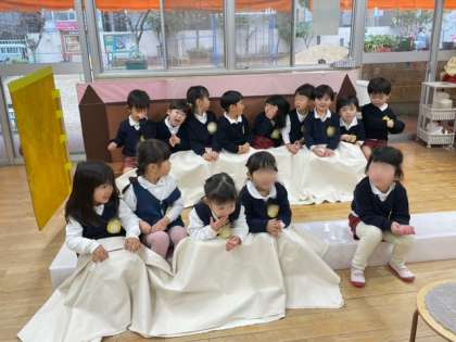 大好きなおうち 公開日 2024/01/20 更新日 2024/01/20 うつぼ日記 4歳児たんぽぽ組はお家ごっこが大好きです。今日はお家の中でお布団をかぶっていました。みんなでお布団をかぶりとっても楽しそうです。先生の歌を聞いたり、歌ったり笑顔がいっぱいです。 いいね(0)