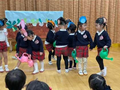 ねずみチューチュー、かわいいポーズ、ねずみになりきっています。「おおきなおおきなかぶになれ」ジョーロで水やり楽しそう。