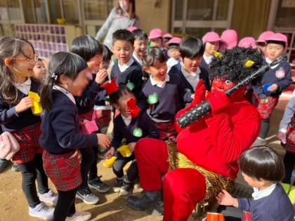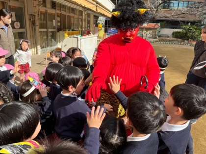 ? おこりんぼ鬼、泣き虫鬼、イジワル鬼、けんか鬼などが自分の中にいないかな?豆まきをして追い出そう!とテラスで豆まきをしていると…赤鬼がやってきました!