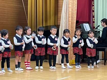 3歳児もも組楽器遊び「てをたたきましょう」カスタネットと鈴を持つのが楽しくてたまらない様子、先生のピアノを聴きながら鳴らしていました。