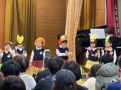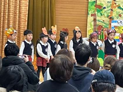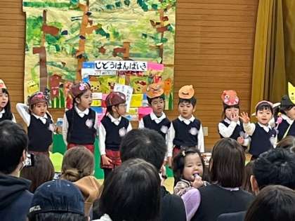 4歳児すみれ組劇遊び「ぽんたのじどうはんばいき」2学期に子どもたちが牛乳パックで作ったじどうはんばいき、ずーっと遊んできました。子どもたちは大勢のお客さんの前で役になりきって存分に劇遊びを楽しんでいました。