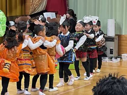 4歳児ばら組劇遊び「とらねことくろねこ」トラネコのたまとクロネコのブルースのお話の世界を存分に楽しんでいる子どもたち、笑顔いっぱい元気いっぱいで動いたりお話したりしていました。