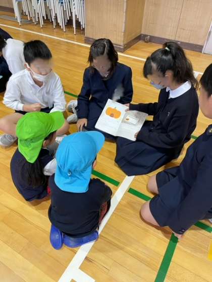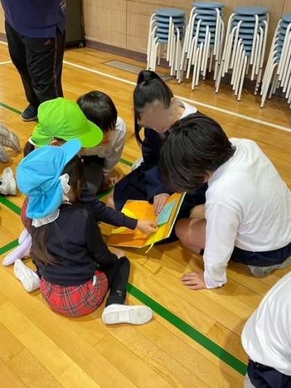 5年生のお兄さんお姉さんたちの手作り絵本は、なんと仕掛け絵本でした。小学校高学年の子どもたちってこんな細かな工夫ができるのかと驚きました。「幼稚園の子どもたちを喜ばすために考えた」「けっこう前から作っていてやっと今日読んであげられる」などと言っていて、優しい気持ちに感動しました。