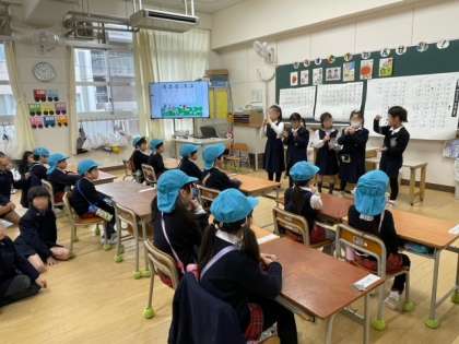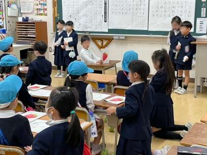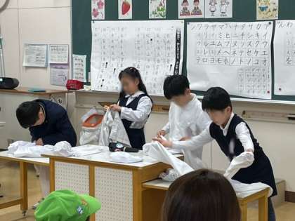 5歳児うめ組ゆり組が西船場小学校に行き、1年生の教室に入り机に向かって椅子に座らせてもらいました。国語や算数の勉強や、縄跳びやあやとりの遊びを見せてもらいました。椅子に座る時の姿勢をおしえてもらってしてみました。少し緊張しながらも1年生の気分になっていました。給食エプロンをすばやくたたむ様子も見せてもらいました。