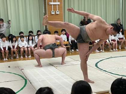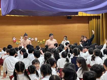 ?今日は靱幼稚園に伊勢ヶ濱部屋の力士、まさるふじさんとまさきふじさんが来てくださいました。しこを踏んで見せてくれたり、子どもたちが「ドスコイ体操」をするのを見てくれました。