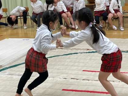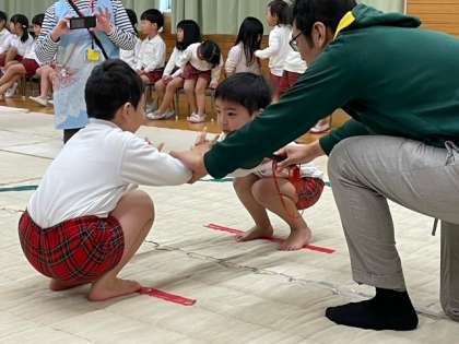 子ども同士で力いっぱい押し相撲をしました。遊戯室に応援の声が響き渡りました。