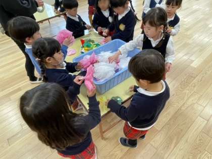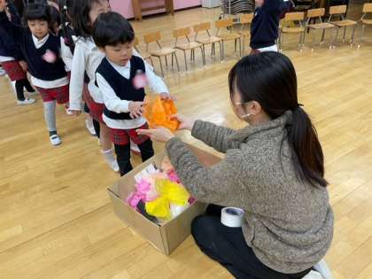 明日はお別れ会です。3歳児4歳児の子どもたちが、お兄ちゃんお姉ちゃんたちにありがとうの気持ちを込めて飾り付けをしていました。幼稚園で一緒に過ごすことができるのもあとわずかです。