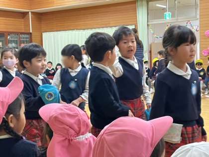 全学年が一緒に過ごせるのはあと少しです。遊戯室に5歳児が入ってくるのを待っていた3-4歳児は拍手で迎えました。