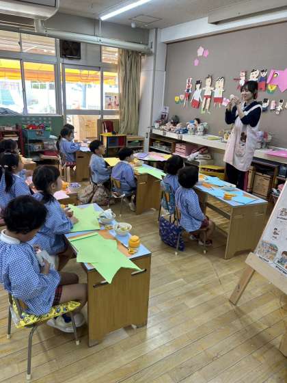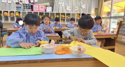 園庭に泳ぐこいのぼりを見て、「大きいね〜」「泳いでいるみたい」とこいのぼりを眺めていたので、子どもたちと一緒にこいのぼりをつくりました。今日は、ハサミやのりを使ってこいのぼりの尻尾やヒレをつくり目を付けました。「かわいいでしょう」「先生みてみて!」と喜んでいました。