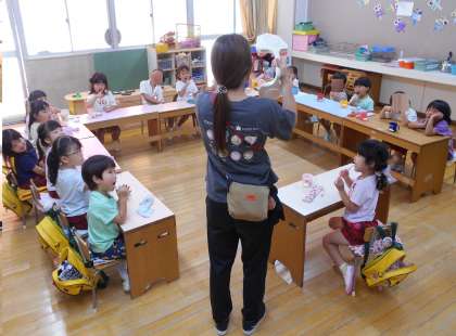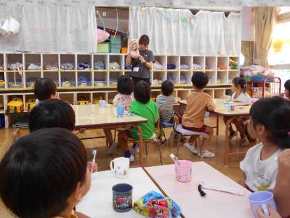 そして、年少組さんも、保健室の先生に教えてもらいながら、みんなで歯磨きをします。