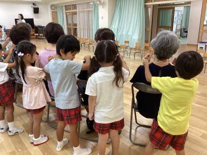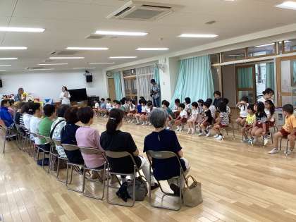 敬老の日の集いをしました。暑い中、92名のおじいちゃんおばあちゃんがお越しくださいました。保育室でままごとや折り紙やブロックをしたり、遊戯室や多目的室で肩たたきをしたり歌を聞いてもらったり体操を披露したり、子どもたちはとても楽しい時間を過ごしていました。おじいちゃんおばあちゃん方の温かい視線に包まれて、ニコニコ笑顔、瞳キラキラの集いでした。