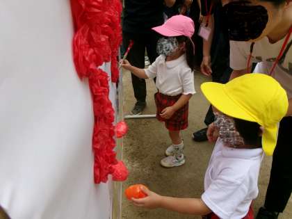 5歳児、4歳児は赤いお花、3歳児はロウソクと果物を親子で運びました。