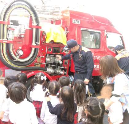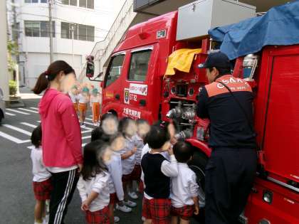 その後、駐輪場に来てくれたポンプ車をクラスごとに見学し、