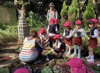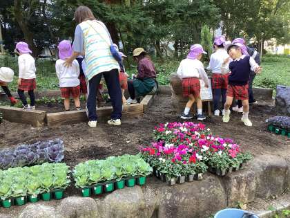 花壇にお花の苗を次々と植えました。3歳児さんは、すぐ近くでどんぐり拾いをして遊びました。