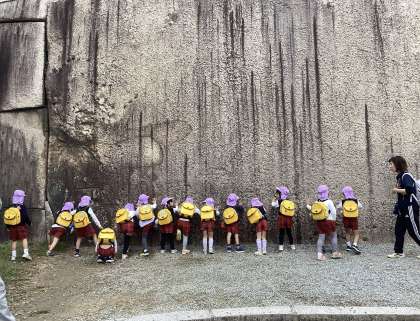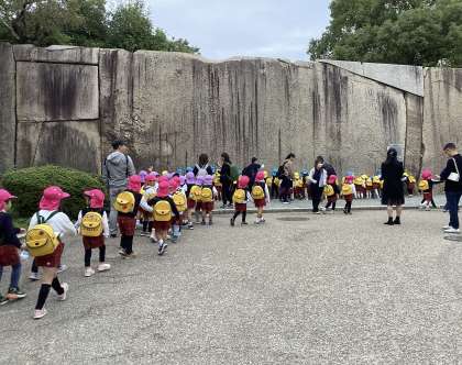 園外保育 公開日 2025/11/06 更新日 2025/11/06 うつぼ日記 今日は、大阪城公園に来ました。曇り空でとても過ごしやすいお天気です。世界中の国からたくさんお客さんが来ています。年長さんは、昨日の音楽会で歌った歌「世界の国からこんにちは」を口ずさんでいました。天守閣には上がらずに、大きな石垣を押したり見上げたりしました。大阪城はとっても大きくて綺麗です。 いいね(0)