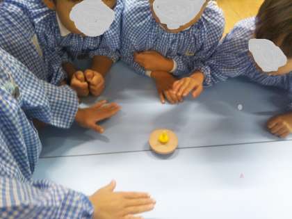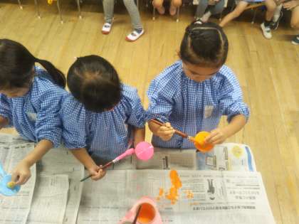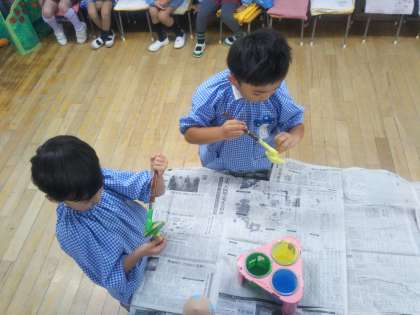 見本のコマをクルクル回して見せると、「やりたい」「回したい」との声で大盛り上がり!絵具が乾いたら、皆で回して遊ぶのが今から楽しみです。