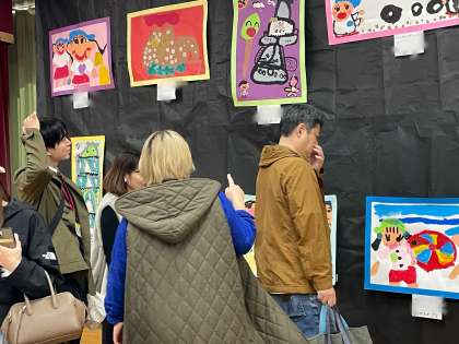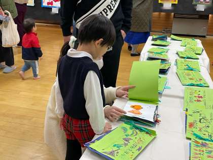 二階には、年長組の子どもたちの絵画と折り紙絵本を展示しました。こんなに大きな紙にこんなにのびのびと筆を動かして自分の気持ちを表現できるようになったのだなと成長を嬉しく思います。どの学年の絵画も、子どもたちの気持ちがしっかり伝わってきます。折り紙絵本は、年長組に進級した春から毎月取り組んできたものです。全学年の日めくりも展示しました。先日保護者の皆さんにご協力いただいたふれあい製作の作品です。どの日めくり表紙もとても味わい深くて素敵です。